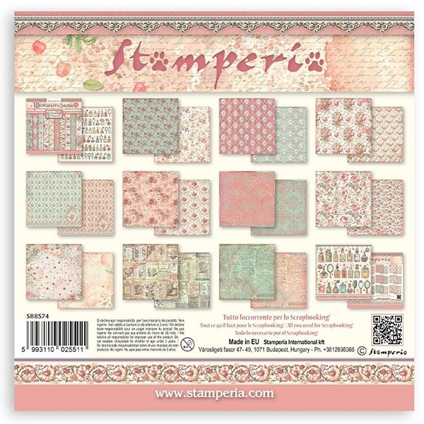 Scrapbookingpapper från Italienska Stamperia av högsta kvalitet. En romantisk och vacker kollektion med doftande rosor, gammaldags parfymflaskor och franska texter. Passar perfekt till handgjorda kort, albumlayouter, minialbum, tags och mycket mer. Glöm inte att matcha med die cuts, stämplar och chipboard från samma serie.