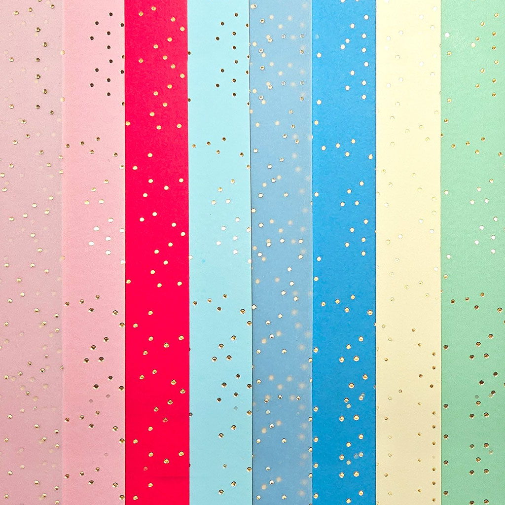 Färgad kartong med gyllene, metalliska prickar på ena sidan. Papperna är kraftiga och kvalitativa och lämpar sig till bl.a handgjorda scrapbookingkort, bröllopsinbjudningar, dopkort och mycket mer!