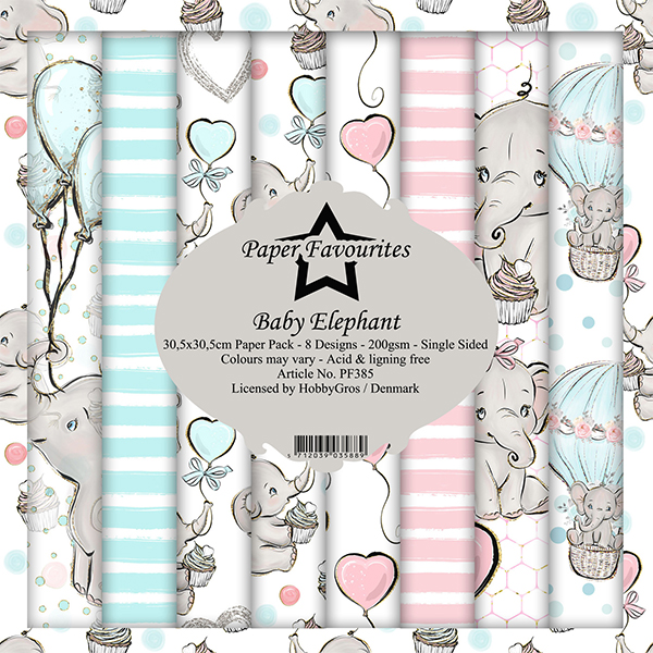 Papperspack med mönstrade scrapbookingpapper från Paper Favourite's kollektion "Baby Elephant". En söt kollektion i rosa och ljusblått med motiv av charmiga elefanter.