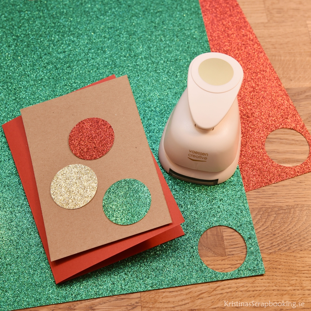 2. Stansa ut 3 cirklar i glitterpapper med en rund handstans. Cirklarna är ca 3,5 cm.