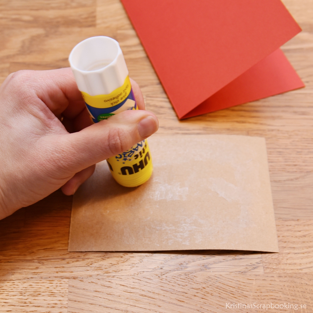 Att göra julkort för vuxna och ungdomar är en rolig och givande aktivitet på pysselträffen, i skolan eller föreningen. Detta julkort kräver få produkter och går bra att variera i olika steg, beroende på hur avancerat du önskar göra. Vi använder färdiga dubbelvikta kort i A6-format. Man kan också skära ut egen kortbas av 200 g kartong i rött eller grönt med måtten 10,5 x 15 cm.