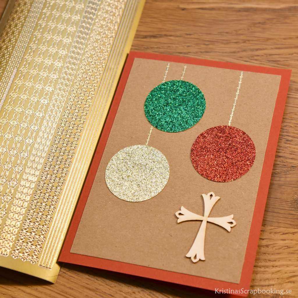 4. Placera ut cirklarna på lagom avstånd. Använd bårder från stickersarket för att göra ”band” till julkulorna. Limma sedan fast cirklarna och korset med limstift.