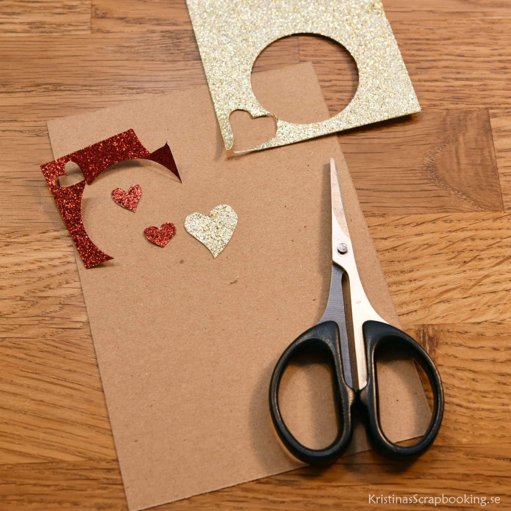 6. Insidan. Limma fast det ena kvist-arket på insidan av kortet och dekorera efter egen fantasi. Skriv en personlig hälsning eller stämpla med julstämplar. Använd spillbitar av glitterpapper för att klippa ut hjärtan, stjärnor, granar m.m, och limma fast som dekoration på insidan av kortet.