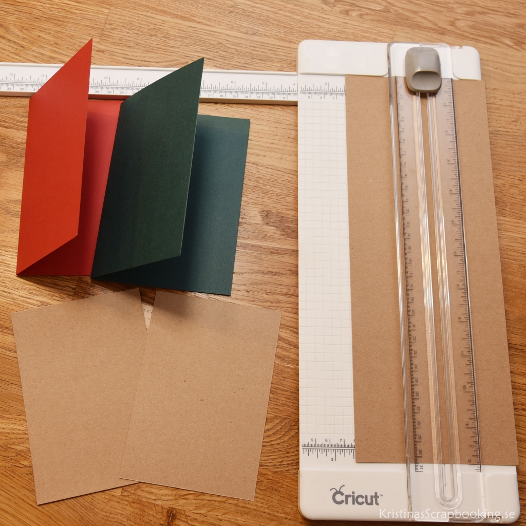 1. Börja med att skära ut kvistpapper i storlek 9,5 x 14 cm. Dvs 1 cm mindre än själva kortet. 2 ark, ett för insida och ett för utsida.