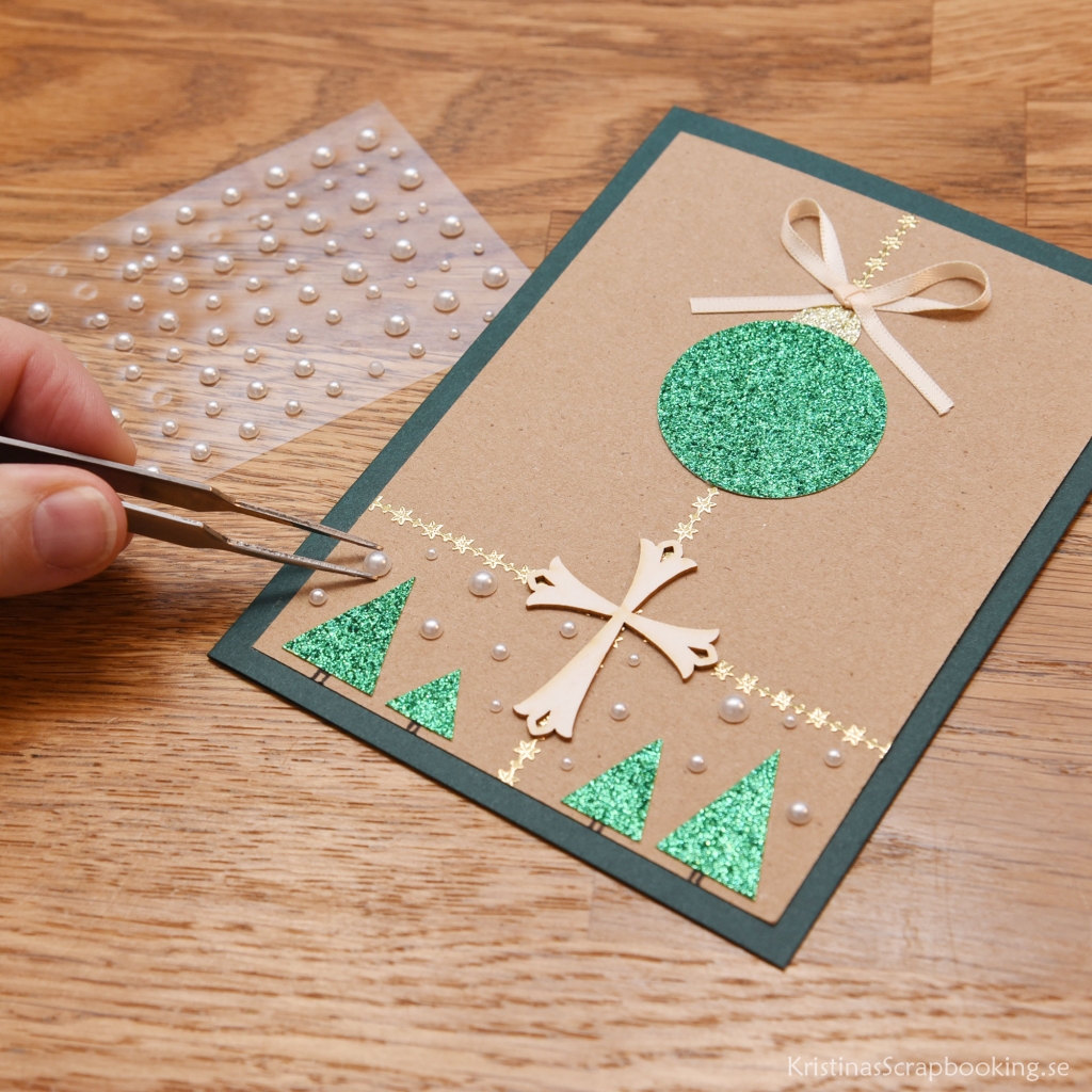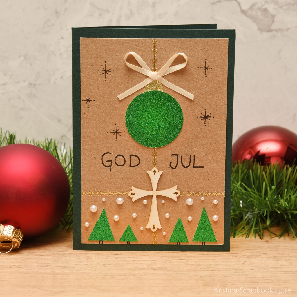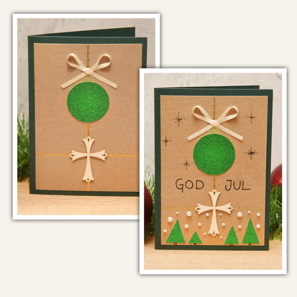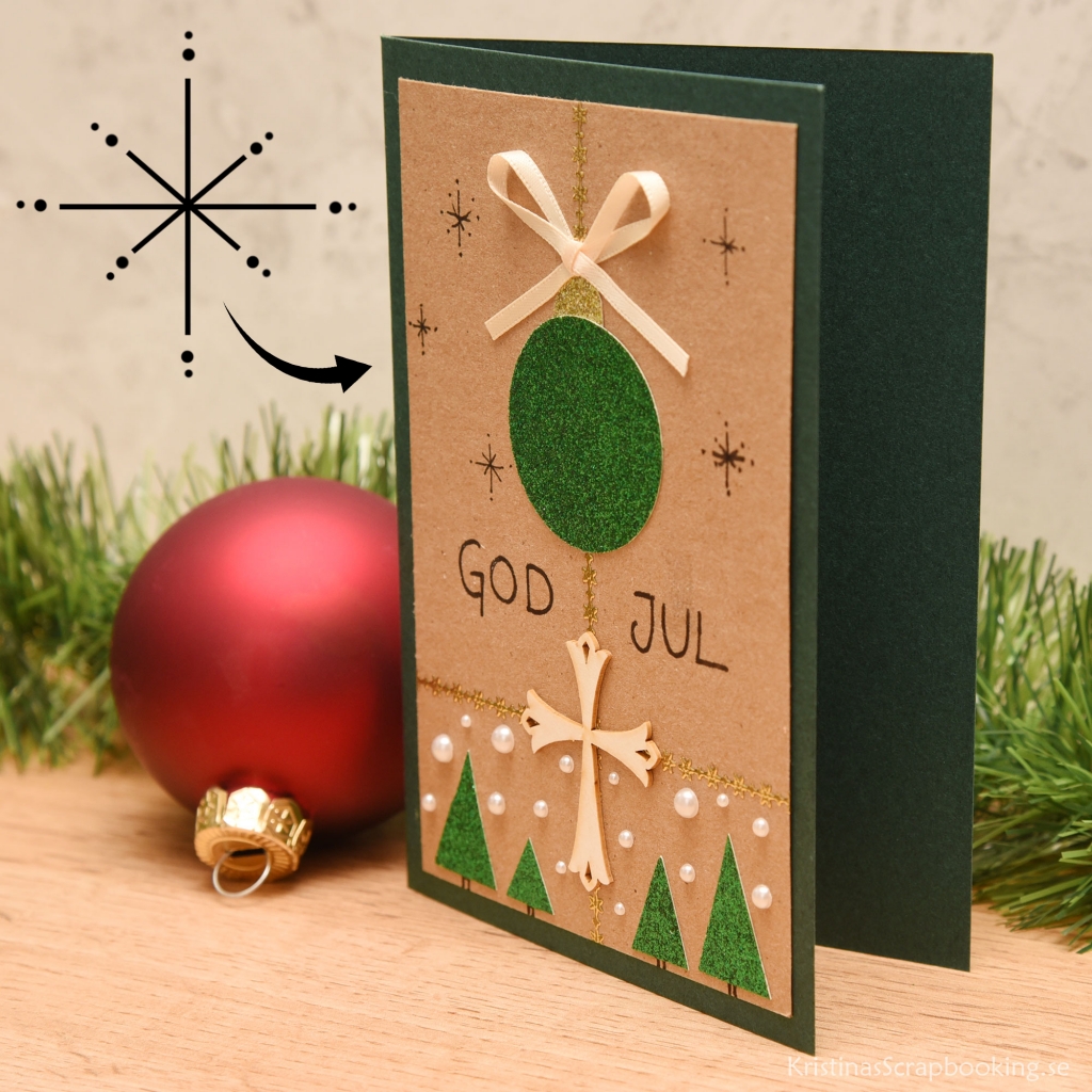 Skapa enkla julkort med färdig kortbas i grönt. Stansa ut och dekorera julkulan och skriv en personlig hälsning i kortet. Perfekt julpyssel för ungdomar och vuxna. Vi använder färdiga dubbelvikta kort i A6-format, som finns att köpa i 50-pack. Man kan också skära ut egen kortbas av 200 g kartong i rött eller grönt med måtten 10,5 x 15 cm.