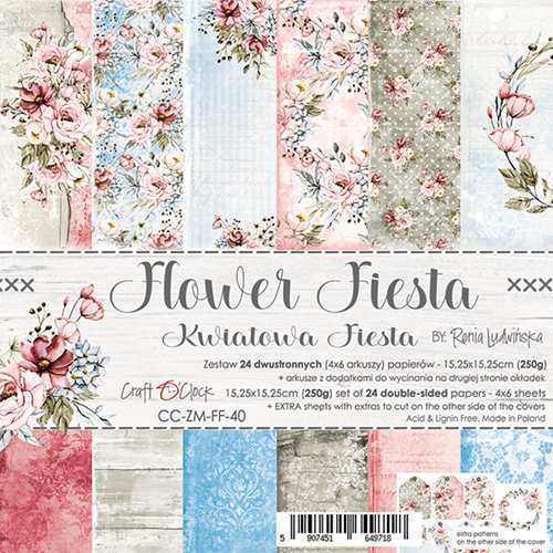 Mönstrat scrapbookingpapper från Craft O' Clock's sommarkollektion "Flower Fiesta". Motiv av vackra blomster i vintagestil, perfekt till dina scrapbookingkort eller albumlayouter med sommarens foton. Dubbelsidiga, kraftiga papper för pyssel och hobby.