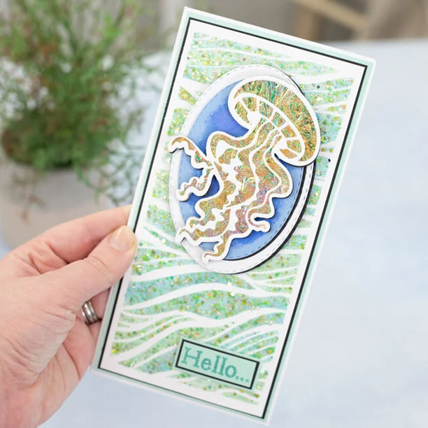 Använd glitterpastan på dina handgjorda kort, papper, trä, glas, duk, terrakotta och mer. Applicera en glittrande finish på dina projekt från papperskollektionen Enchanted Ocean från Crafter's Companion. Matcha med mönstrade papper, dies, shimmer spray, stämplar och andra tillbehör i samma serie.