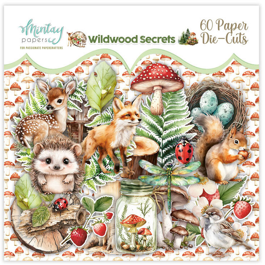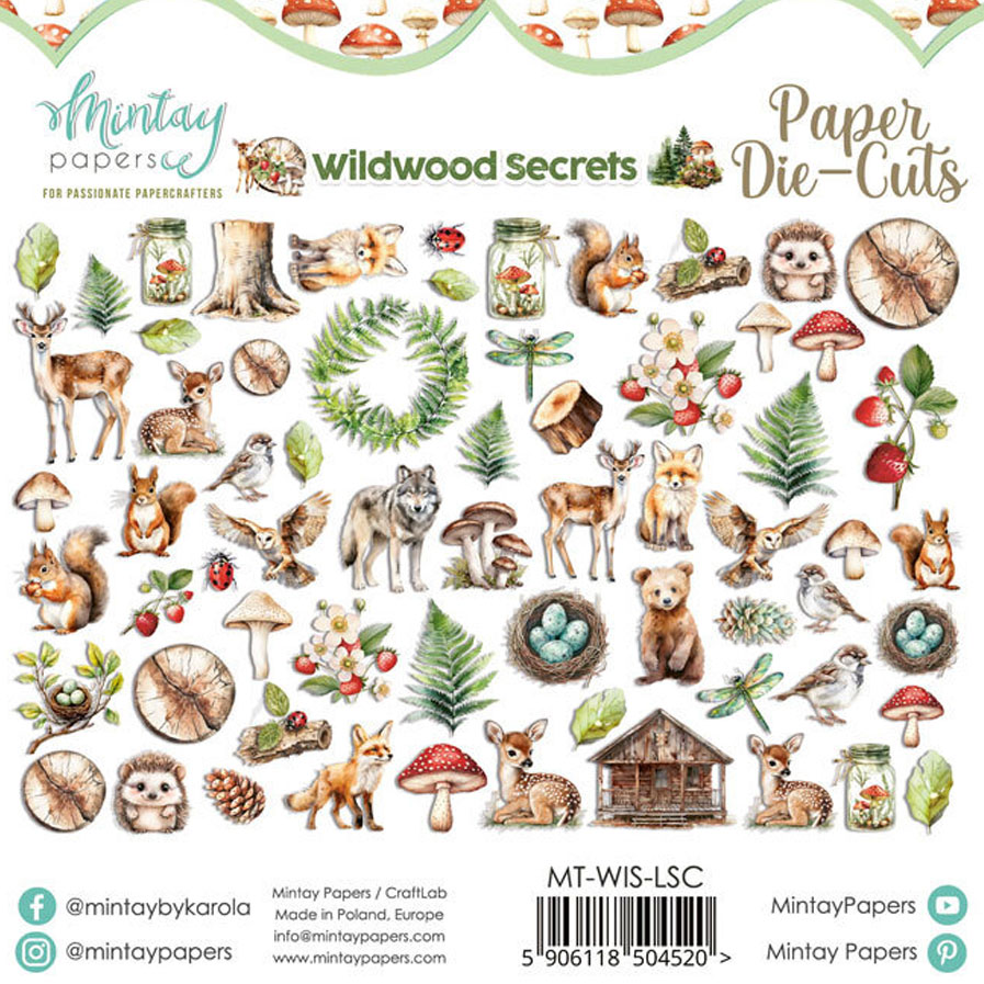 Färdigutskurna figurer i kraftigt papper från Mintays skogsinspirerade kollektion "Wildwood Secrets". Innehåller 60 delar med söta djur, svampar, bär och träd. Matcha med mönstrade papper från samma kollektion.