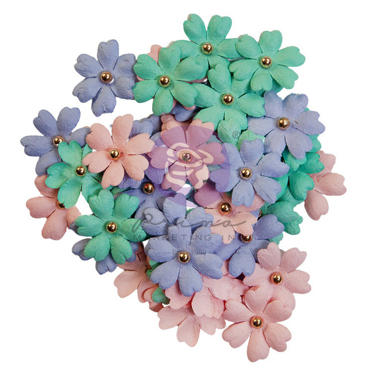 Dekorativa och detaljrika blommor av mulberrypapper från Prima Marketing med liten guldpärla i blommans mitt. Mycket välgjorda blommor för scrapbooking och mixed media-projekt. Vackra färger i rosa, lavendel och mint.
