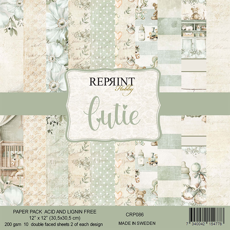 10 st mönstrade scrapbookingpapper med Reprints kollektion "Cutie". Söta barn- och bebismotiv i vintagestil. Harmoniska nyanser i mjukt mossgrönt, jordnära bruna och eleganta beige toner. Matcha med enfärgade cardstock från samma kollektion.