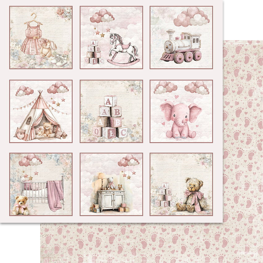 Scrapbookingpapper från Reprint med babymotiv i rosa och blått. Perfekt att använda till handgjorda dopkort, grattiskort, babyalbum och andra kreativa alster. Tjockt 200 grams papper med matt yta och motiv på fram- och baksida.