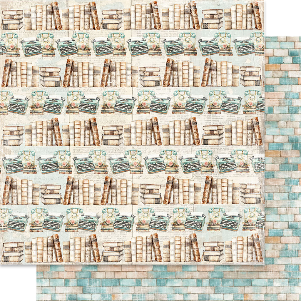 Mönstrade papper med gammaldags motiv från en bokhandel. Kollektionen heter "The Bookshop" och består av ljusa färger i dov turkos och rosa. Kombinera med enfärgade cardstock från samma kollektion.