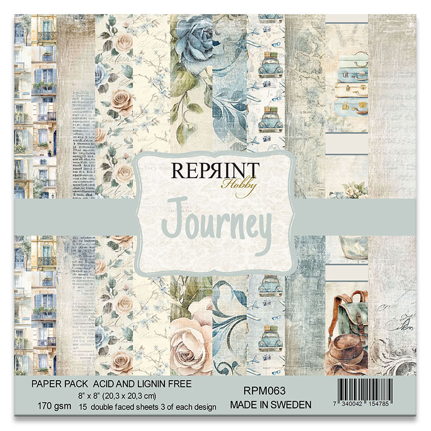 Mönstrade papper från Reprint. Serien heter "Journey" och består av klassiska resemotiv med vintageinspiration. Kollektionsförpackning med 15 dubbelsidiga ark av högkvalitativ 170 grams kartong, perfekt för scrapbooking, korttillverkning och andra kreativa projekt.