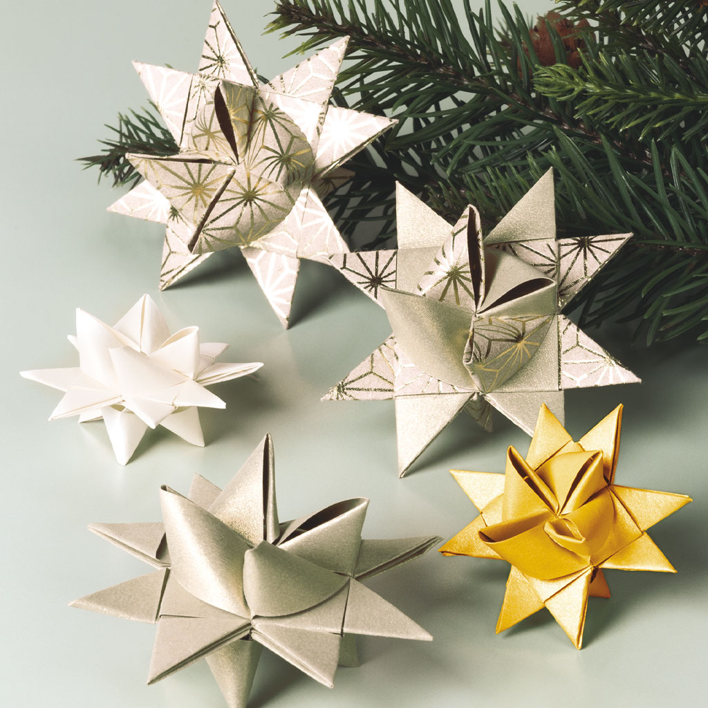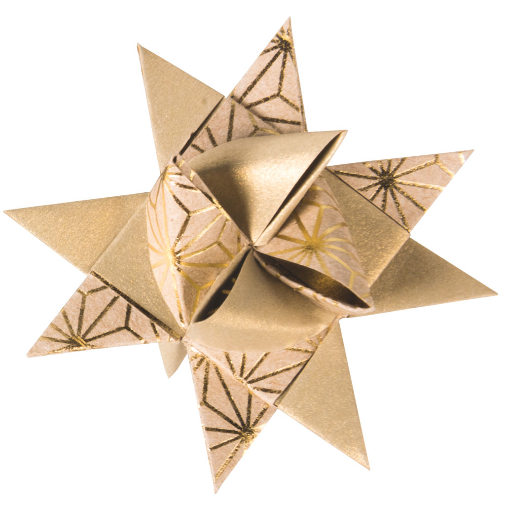 Set med stjärnstrimlor för att vika 24 st stjärnor i två olika storlekar, cirka 4,5 och 7 cm i diameter. Dessa traditionella vikstjärnor kallas även Froebelstjärnor.