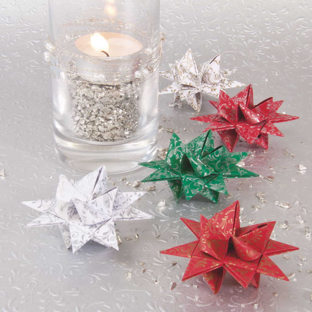Set med stjärnstrimlor för att vika 24 st stjärnor, cirka 7 cm i diameter. Dessa traditionella vikstjärnor kallas även Froebelstjärnor.