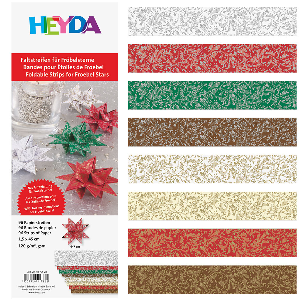 Remsorna är dubbelsidigt tryckta och genomfärgade i julens färger med elegant mönster. I paketet ingår en folder med steg-för-steg bilder och förklarande text. Strimlorna kan även användas till quilling och andra typer av papperspyssel. Tillverkade i 120 grams papper av hög kvalitet.
