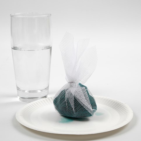 Steg 3: Tyllpåsen med ägget fuktas med vatten och ställs för att torka.