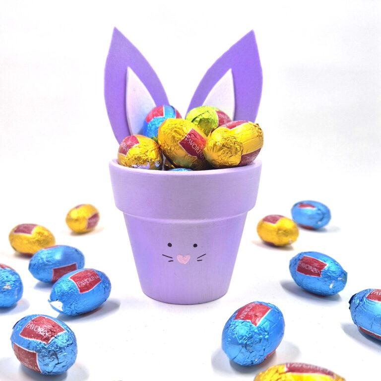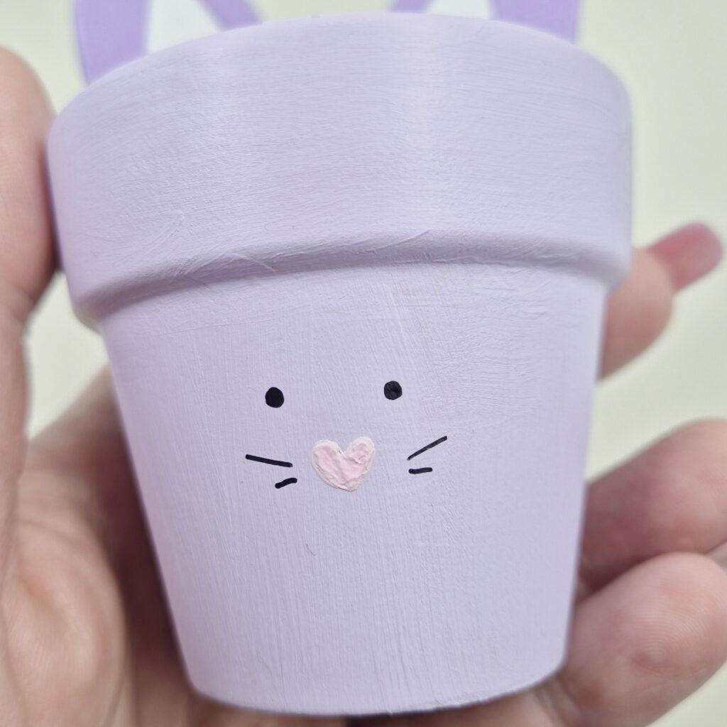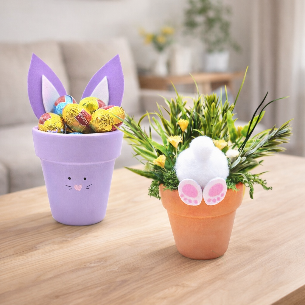 Påskpyssla med barnen och skapa söta kaniner i krukor. Måla och dekorera efter egen fantasi. Här visar vi två modeller: