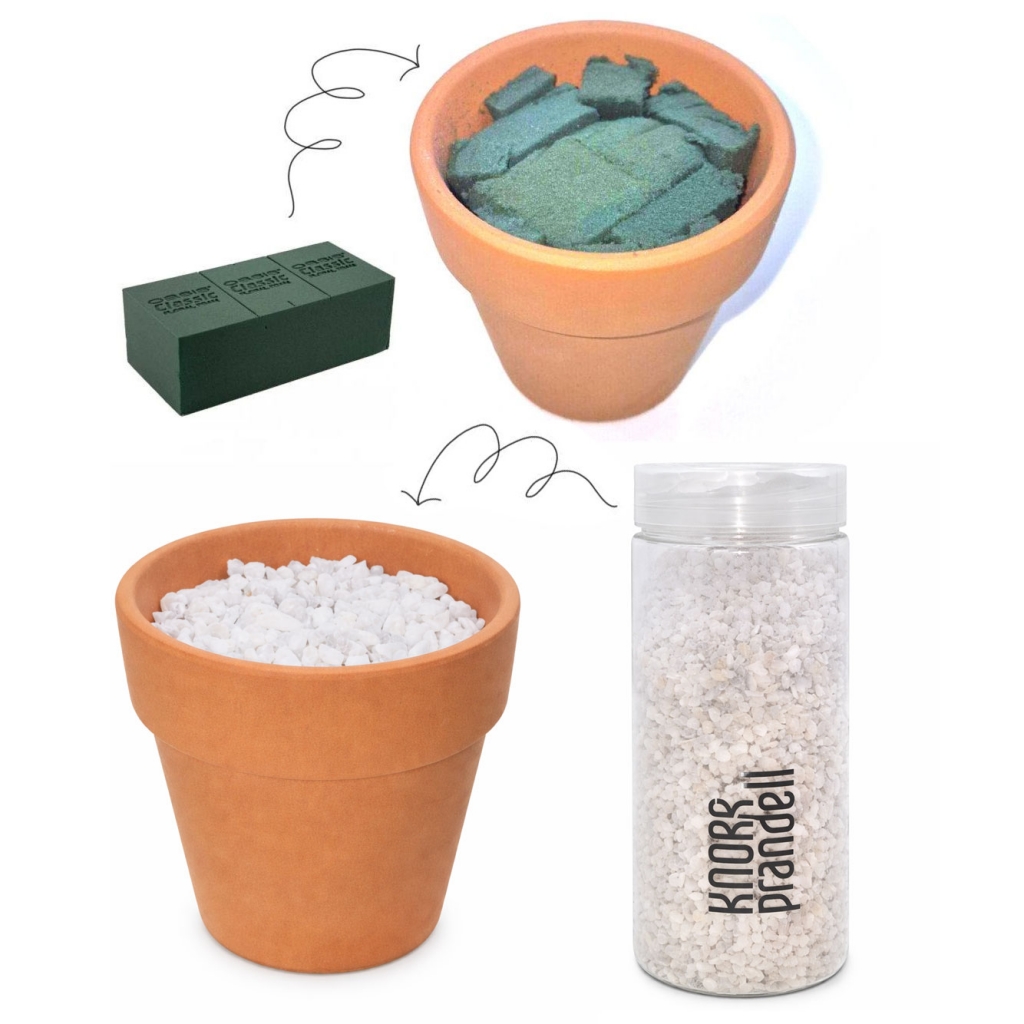 1) Skär eller klipp ut bitar av oasis och fyll krukan. Häll över ett tunt lager grov dekorationssand.