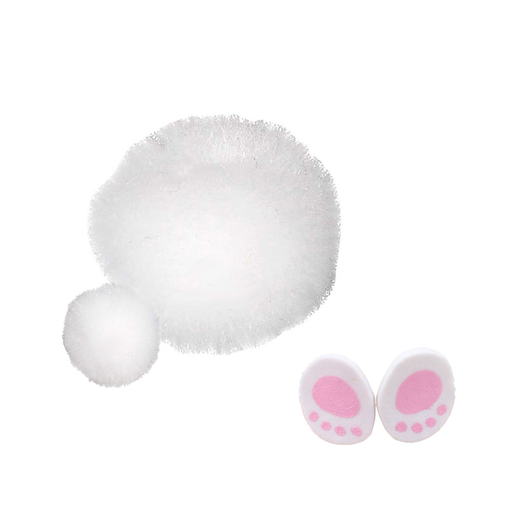 3) Limma fast svansen. En liten vit pompomboll ovanpå en större. Klipp ut kaninfötter från vit mossgummi och måla rosa trampdynor på undersidan.