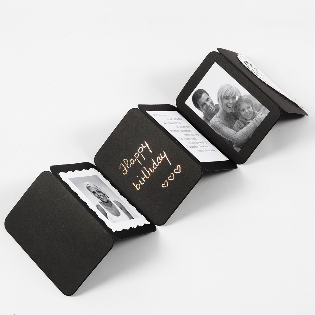 Presentask i kraftig kartong som vid öppning 'exploderar' i flera lager av fickor och fack. De medföljande dekorationsföremålen dekoreras med personliga meddelanden, bilder, utklipp, decoupage m.m.