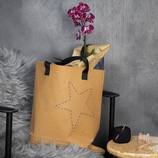 Kasse av kraftigt läderpapper med handtag i svart polyester.