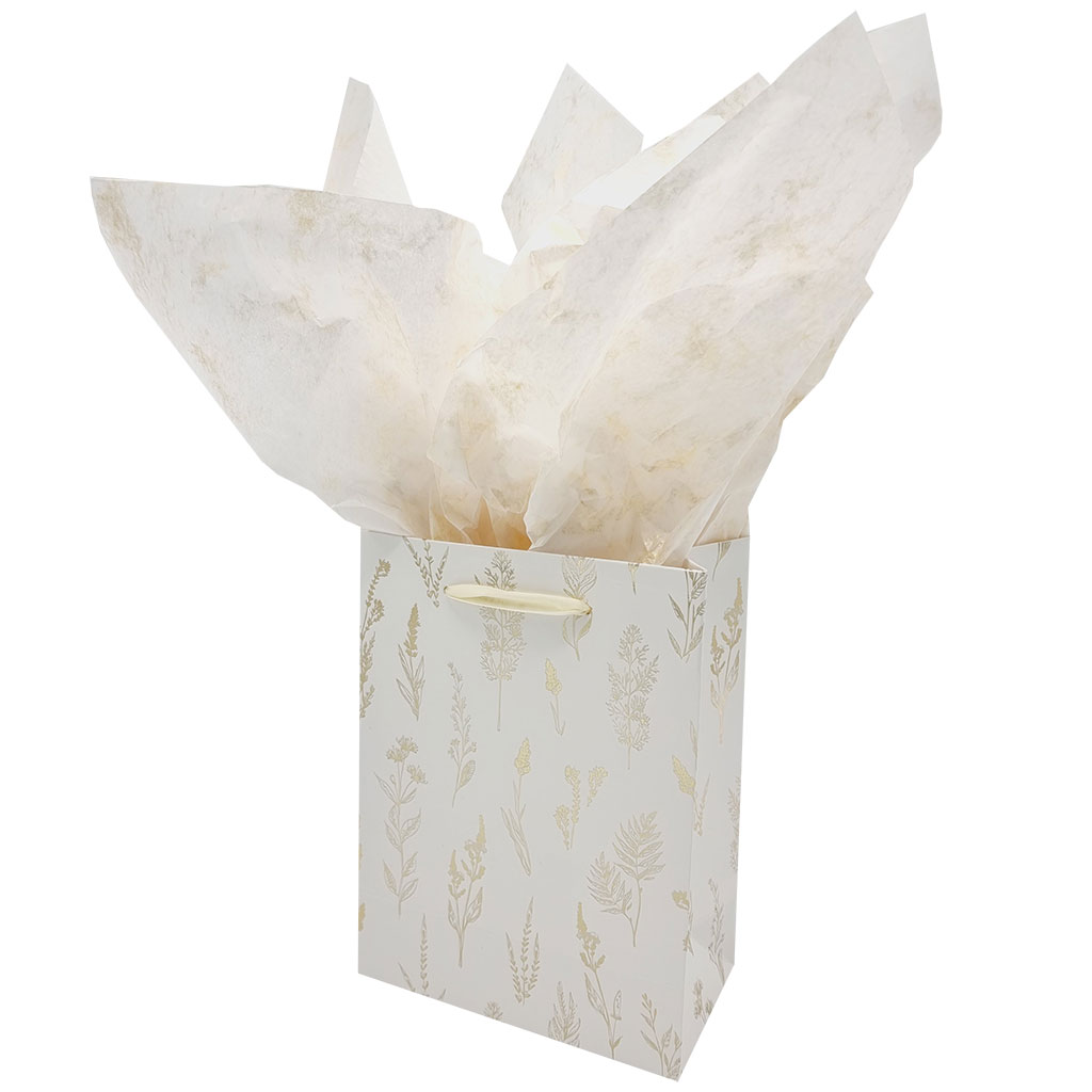 Presentpåsar med vacker design av ängsblommor i guldfolie och ett handtag av satinband. Ge bort presenter med stil, enkelt och snyggt! Glöm inte att fylla din presentpåse med silkespapper för vacker utfyllnad.