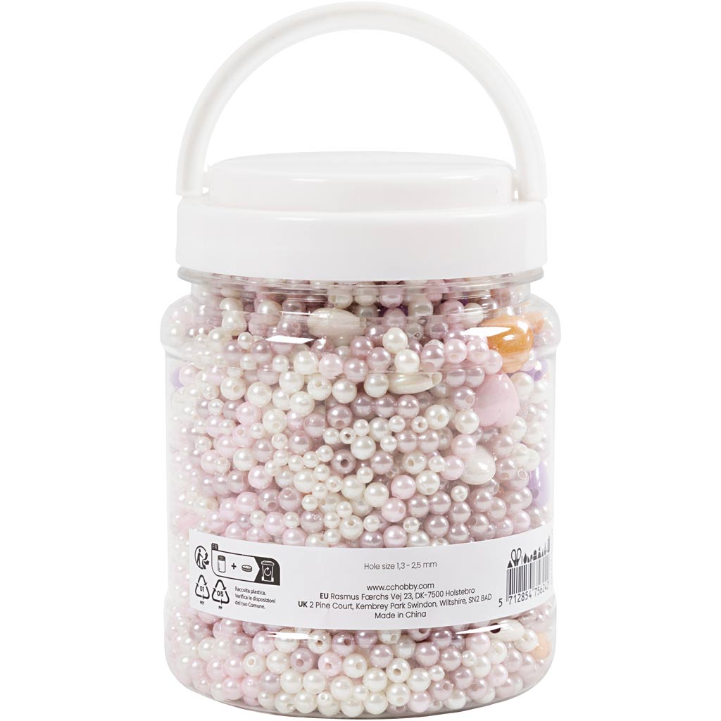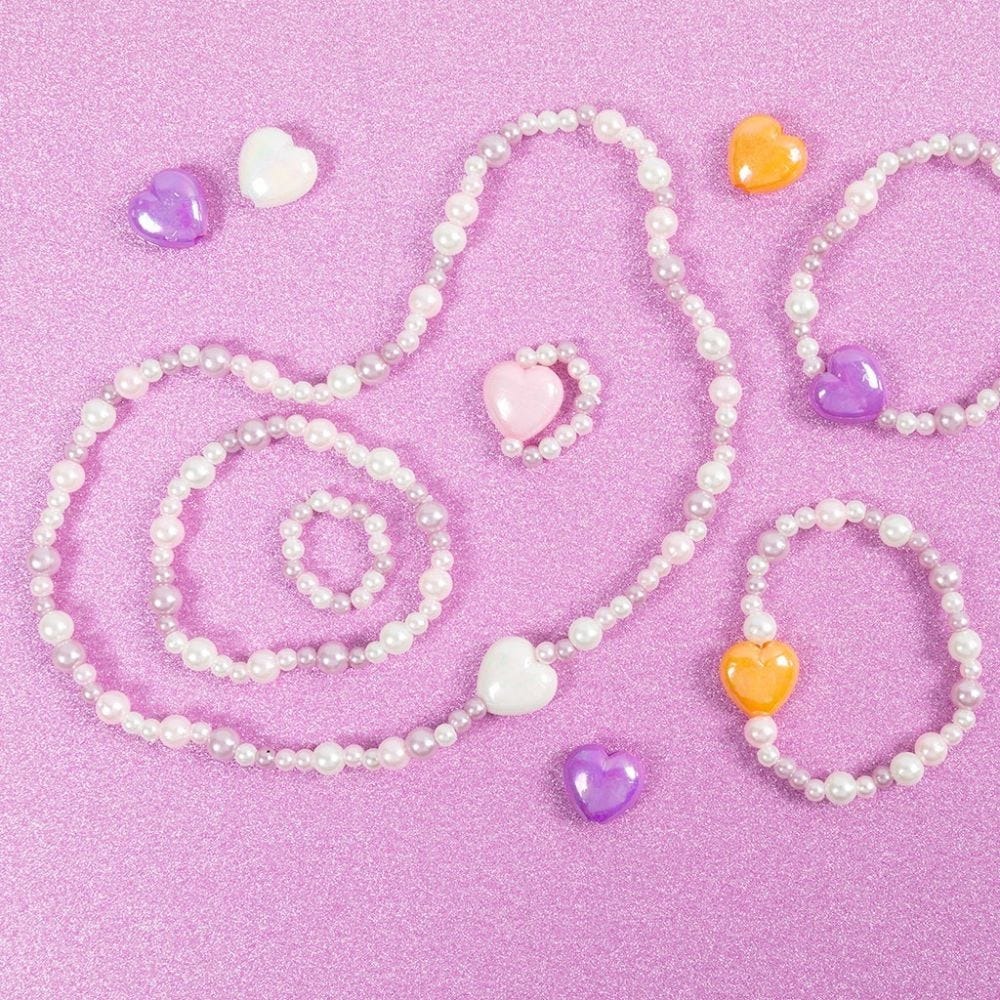 Pärlmix med runda och hjärtformade vaxpärlor i pärlemorfärger. Enkla att trä på smyckessnöre med pärlnål – perfekt för barn och vuxna som vill skapa egna smycken. Kombinera färger och former för unika halsband och armband. Använd elastisk smyckestråd 1 mm.