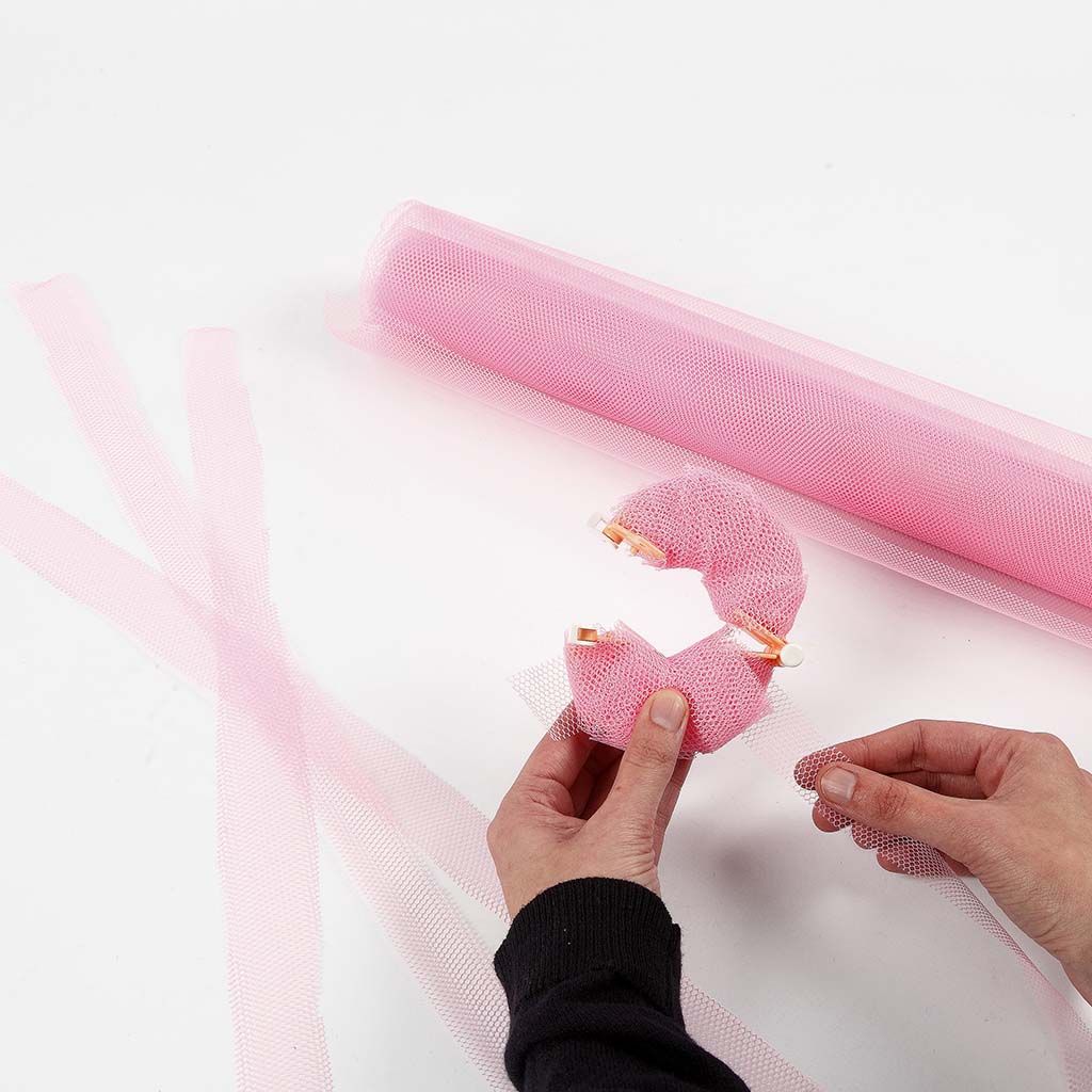 3. Montera enhörningen och tyllpompomen med hjälp av snöret i pompomen och 2 O-ringar som kläms ihop med en plattång.