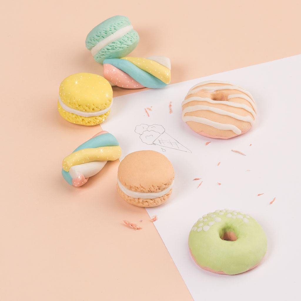 Mjuk modelleringslera i fina pastellfärger, varav tre med glittereffekt, särskilt framtagen för att skapa egna suddgummin. Kan också användas som vanligt lera. Härdas i ugn i 125 °C, ca 30 minuter.