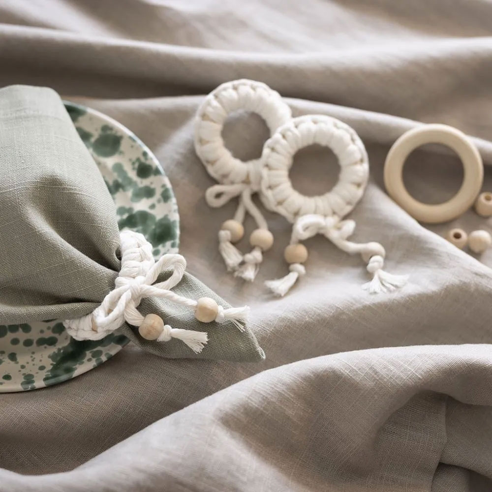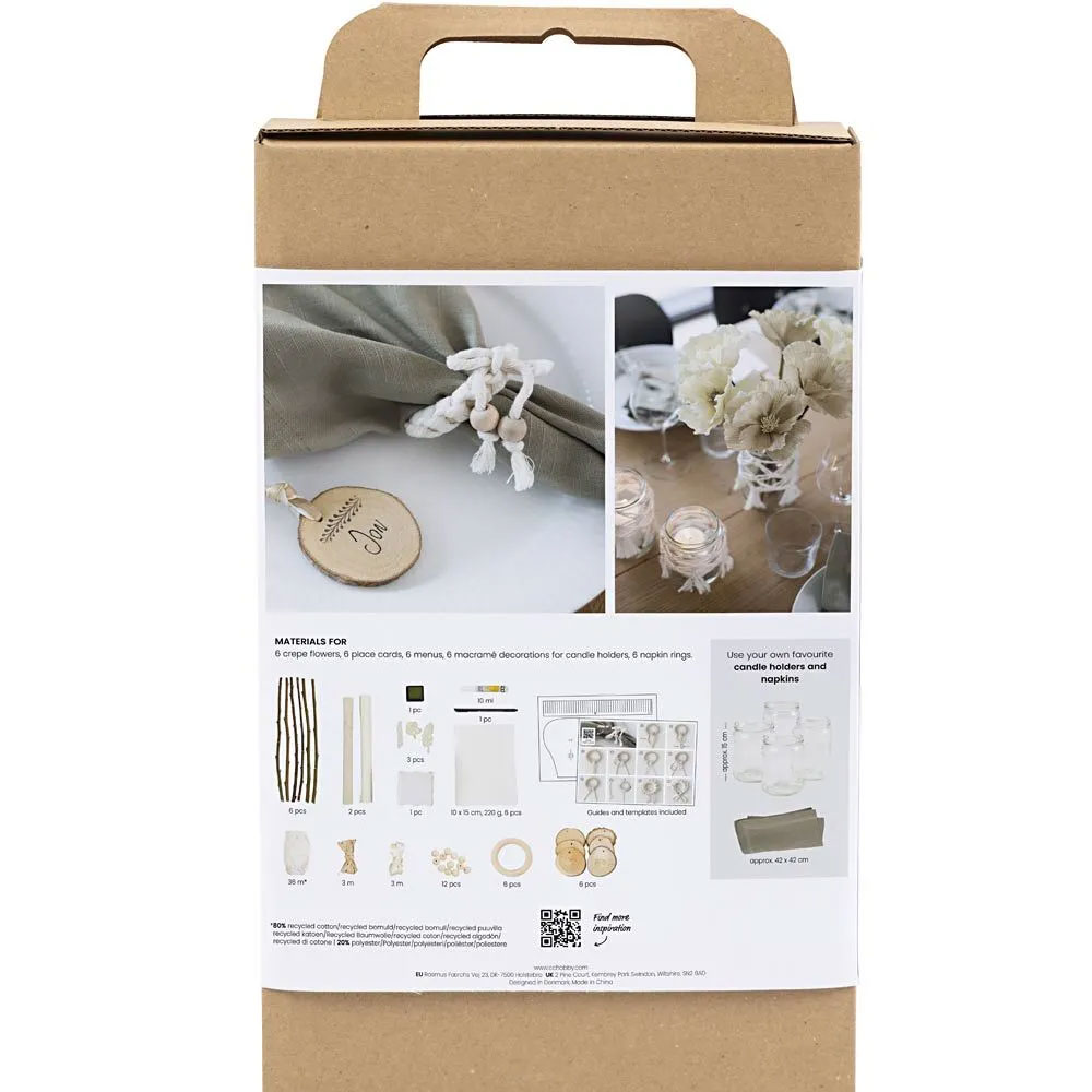 Skapa en alldeles egen, unik dukning med dekorationsmaterial från detta DIY pysselkit. Med väl genomtänkta produkter i stillsamma naturfärger skapar du servettringar och ljusglas med macramé-knyt-teknik, söta kräppblommor, menyer och bordsplaceringskort av runda träskivor. Perfekt för dig som tycker om en jordnära, mysig och bohemisk stil. Allt som behövs ingår i kitet, men en sax är bra att ha till hands.
