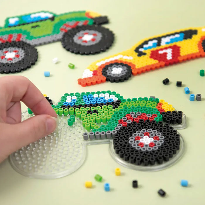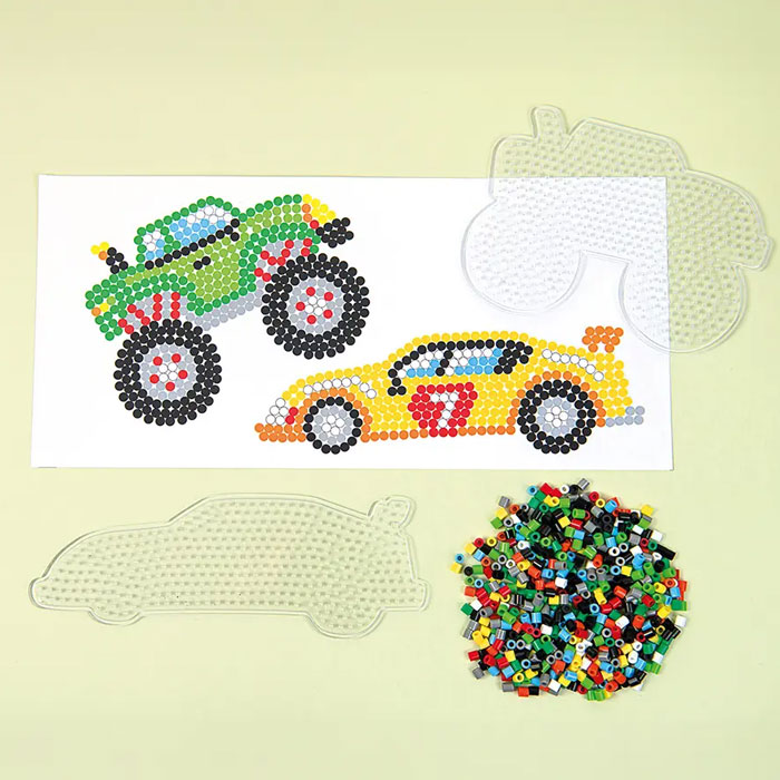 Kreativt pärlset med motiv av racerbil och monstertruck. Setet innehåller två genomskinliga pärlplattor som gör det enkelt att följa medföljande mönsterkort och skapa figurer med midi rörpärlor. Tillverkat i Sverige.