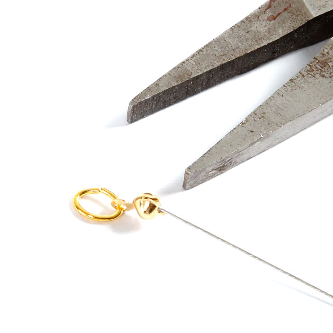 1. Knuttäckare och wireklämma träs på smyckewiren och klämman trycks platt, wiren klipps och knuttäckaren stängs runt klämman.