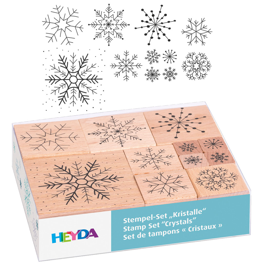 Stämpelset med 11 trämonterade julstämplar med snöflingor i olika storlekar. Perfekta för att dekorera papper, kartong, julkort, presentpåsar, etiketter och paketinslagning. Stämplarna kan även användas i lufttorkande lera för att skapa vackra mönster. Levereras i en praktisk plastförsedd displayask för enkel förvaring.