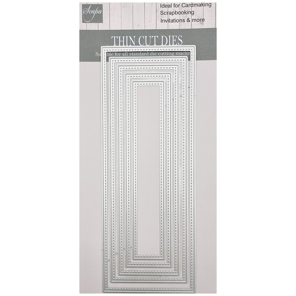 Dies av högkvalitativ metall från Reprint som passar till dem flesta stansmaskinerna på den svenska marknaden. Perfekta för korttillverkning med slimline-format. Dekorativa rektanglar med små "stygn" längs kanterna.