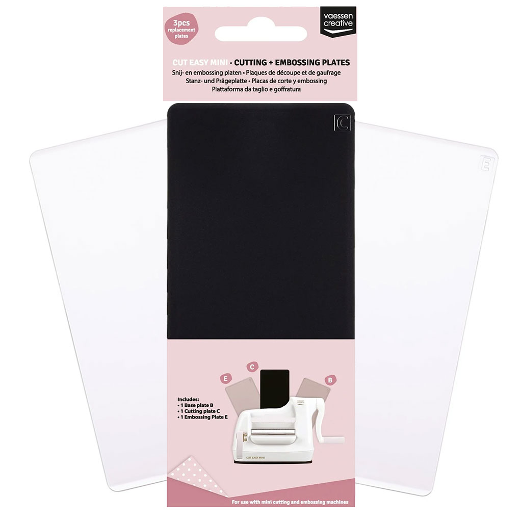 Set med plattor till Cut Easy Mini. Innehåller basplatta, skärplatta och embossingplatta som används för både stansning och embossing.