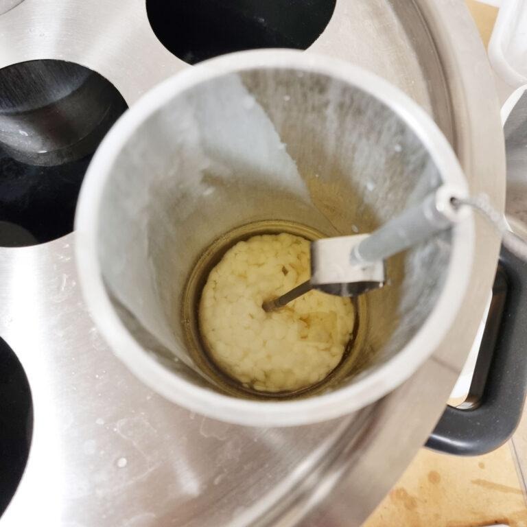 4) Håll koll på temperaturen med hjälp av t.ex. en stektermometer, så att massan inte blir för varm. Sojavax smälter vid ungefär 60°C.