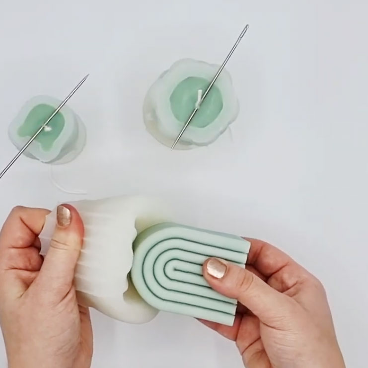1) Förbered formen: När du köper en silikonform för första gången, måste du själv göra ett hål i botten, så centrerat du kan. Det är här veken ska sticka igenom. Använd en kraftig nål eller hålnålsverktyg.
