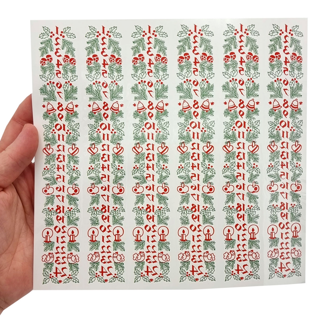 Datum dekaler med röda siffror för fastsättning på ljus. Tänk på att remsan är 18,5 cm lång, och kräver därför ljus som är minst 18,5 cm.