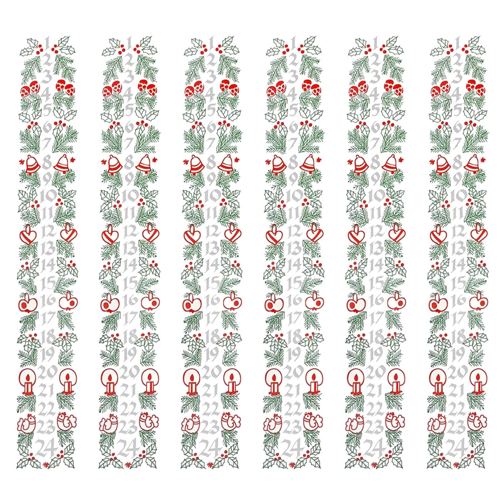 Datum dekaler med vita siffror för fastsättning på ljus. Tänk på att remsan är 18,5 cm lång, och kräver därför ljus som är minst 18,5 cm.