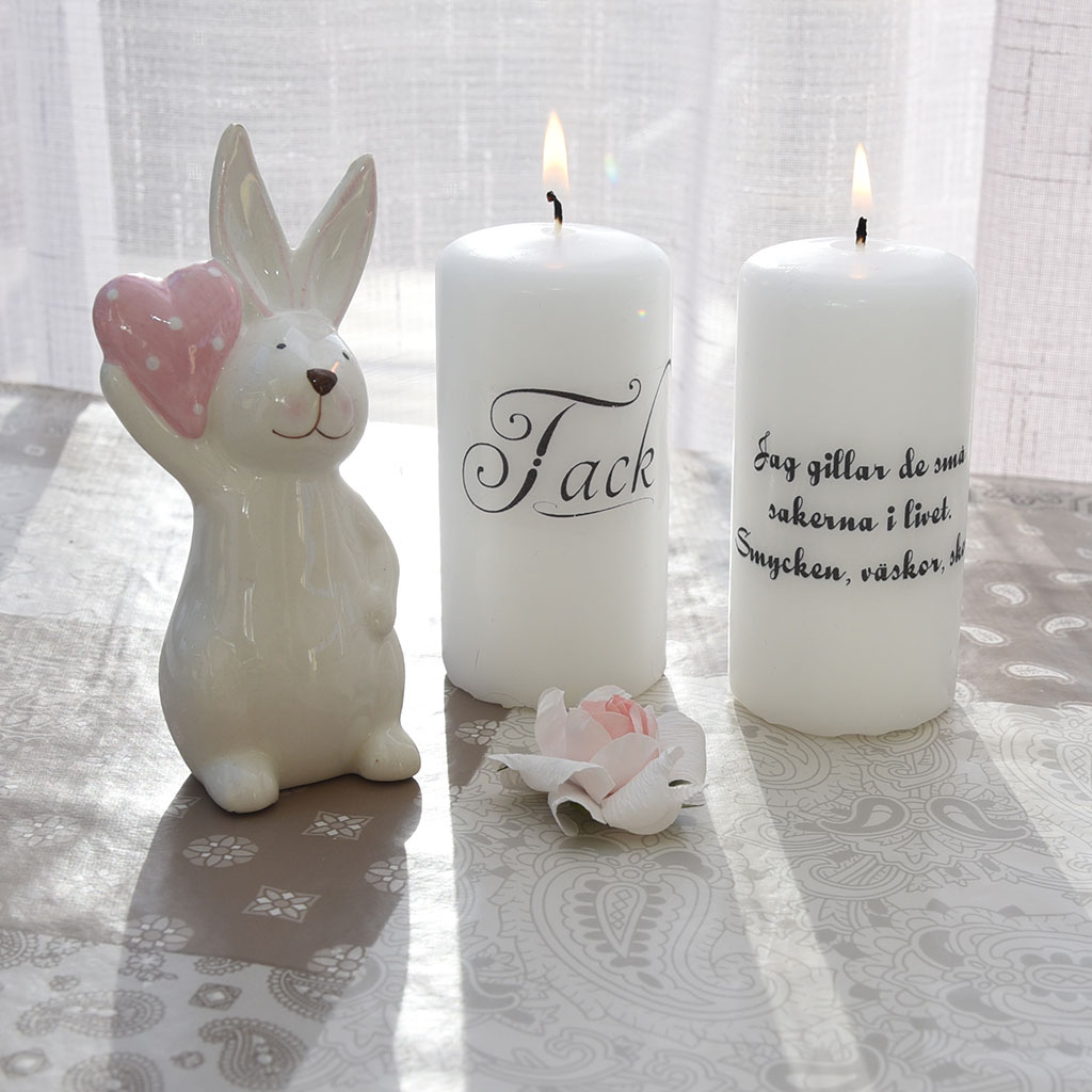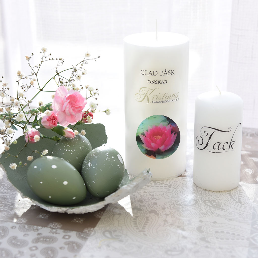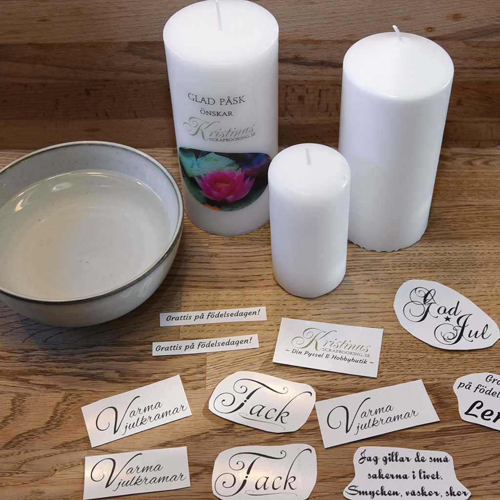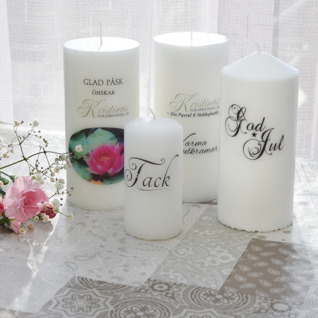 Med transferpapper för ljus kan du skriva ut foton och texter direkt från din laserskrivare, och enkelt applicera på ljus. Här har du möjlighet att göra personliga ljus till bröllop, födelsedagar ditt favoritdjur eller kanske loggan på ditt favoritlag. Skriv ut på laserskrivare (inte bläck) och låt motivet ligga ca 30 sekunder i ljummet vatten. Ta bort det vita skyddspappret och fäst motivet på ditt ljus. Låt torka några timmar tills motivet har härdat fast. Motivet brinner ner tillsammans med ljuset utan att sota eller lämna rester.