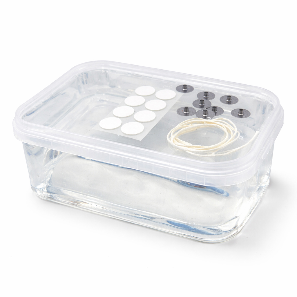 I kitet ingår veke, anpassad för gelvax, 8 st vekhållare och 8 st självhäftande wick stickers för enkel montering och centrering av veken.