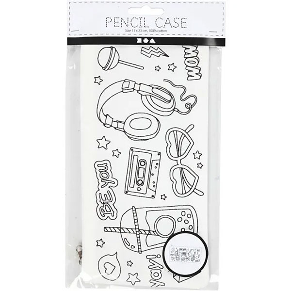 Vitt pennfodral med förtyckt motiv av 100 % bomull och praktisk dragkedja.