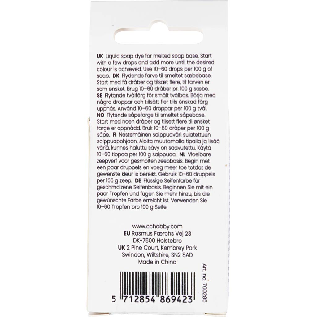 Flytande tvålfärg för tvåltillverkning av tvålbas och hemmagjorda tvålar. Färgen går att variera i flera nyanser baserat på mängden som tillsätts. Använd 10-60 droppar per 100 g tvål. Du kan även tillsätta doftolja för en härlig doft.